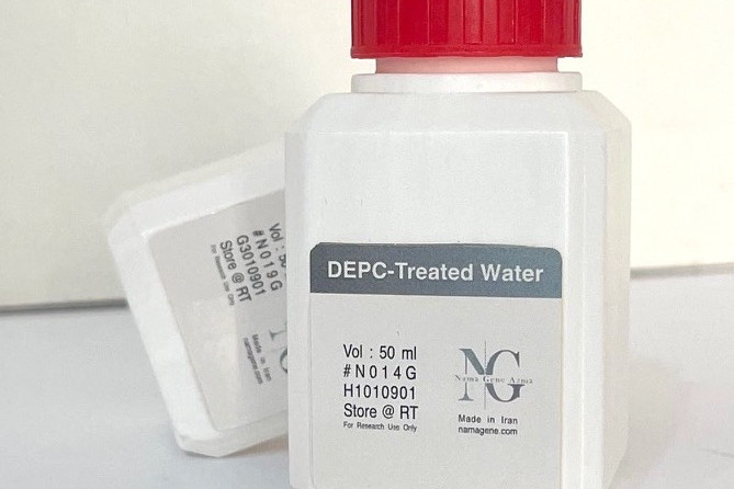 دی اتیل پیروکربنات(DEPC) یک عامل آسیله کننده (acylating agents) قوی است و در طی فعالیت عامل RCO را به ترکیبات اضافه می کند. DEPC در بسیاری از پروتئینها باعث تغییر اسید آمینه هیستیدین می شود و متعاقب آن بسیاری از آنزیمها غیر فعال می شوند. DEPC بعنوان مهار کننده قوی RNase شناخته می شود. هنگام کار با RNA بهتر است از آب تیمار شده با DEPC استفاده شود. این محصول شرکت نماژن آزما بصورت شفاف و فاقد هرنوع اندونوکلئاز، نوکلئاز و RNase است. محصول نهایی فاقد DEPC است و به راحتی برای واکنشهای بیوشیمیایی و بیولوژی مولکولی قابل استفاده می باشد. این محصول در استخراج RNA و ساخت cDNA کاربرد دارد.